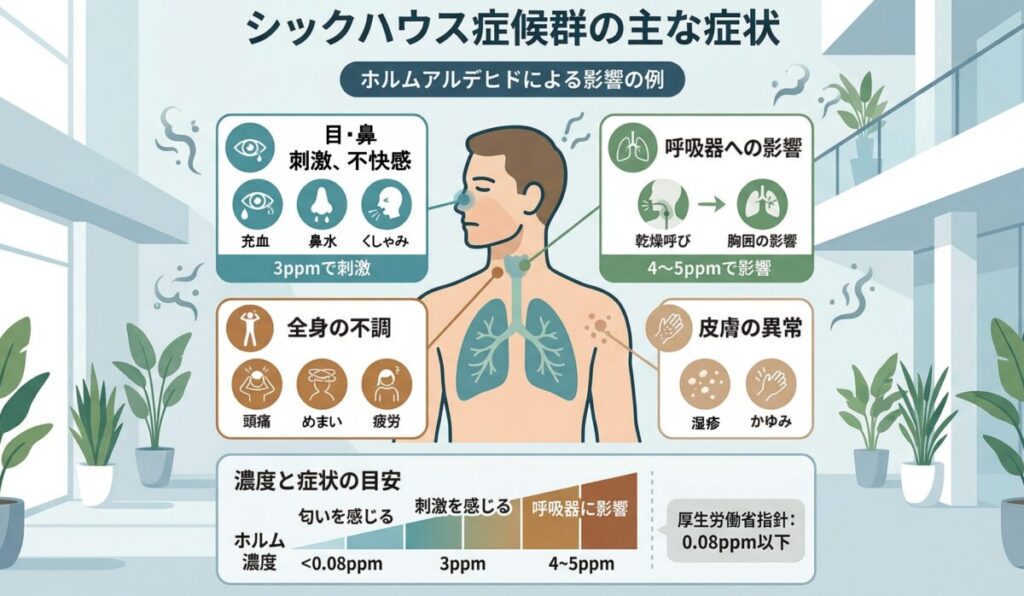新築の建物に入ると何もかもが新しく心躍りますが、注意しなければならないことがあります。それが「シックハウス症候群」です。シックハウス症候群は、壁紙やフローリングなどの住宅建材から発生するホルムアルデヒドやパラジクロロベンゼンといった化学物質などにより、頭痛や目の炎症、呼吸困難などの体調不良が引き起こされるもの。