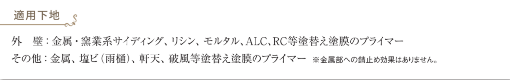 塗り替え工事では、外壁材そのものだけでなく、既存塗膜の状態や相性まで見て材料を選ぶ必要があります。対応下地の幅が広いことは、現場での選定のしやすさにもつながります。