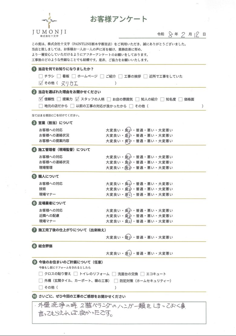 「外壁洗浄の時、2階ベランダのハンガー類をしまっておく事、言ってもらえば良かったです。」